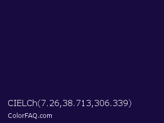 CIELCh 7.26,38.713,306.339 Color is a very dark indigo color and the nearest color is Tolopea #1b0245. Hex code #180b40 and RGB value is rgb(24,11,64). In RGB color space, this color is composed of 9% red, 4% green, 25% blue, In CMYK color space, this color is composed of 63% cyan, 83% magenta, 0% yellow , 75% black , In HSL color space, this color has a hue angle of 255° , 71% saturation and 15% lightness.