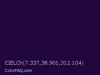 CIELCh 7.337,38.901,312.104 Color is a very dark violet color and the nearest color is Violet #240a40. Hex code #21073d and RGB value is rgb(33,7,61). In RGB color space, this color is composed of 13% red, 3% green, 24% blue, In CMYK color space, this color is composed of 46% cyan, 89% magenta, 0% yellow , 76% black , In HSL color space, this color has a hue angle of 269° , 79% saturation and 13% lightness.