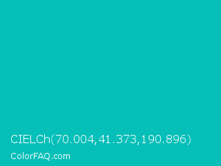 CIELCh 70.004,41.373,190.896 Color is a normal cyan color and the nearest color is Tiffany Blue #0abab5. Hex code #05bfb8 and RGB value is rgb(5,191,184). In RGB color space, this color is composed of 2% red, 75% green, 72% blue, In CMYK color space, this color is composed of 97% cyan, 0% magenta, 4% yellow , 25% black , In HSL color space, this color has a hue angle of 178° , 95% saturation and 38% lightness.