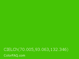 CIELCh 70.005,93.063,132.346 Color is a normal green color and the nearest color is Harlequin Green #46cb18. Hex code #45c405 and RGB value is rgb(69,196,5). In RGB color space, this color is composed of 27% red, 77% green, 2% blue, In CMYK color space, this color is composed of 65% cyan, 0% magenta, 97% yellow , 23% black , In HSL color space, this color has a hue angle of 100° , 95% saturation and 39% lightness.