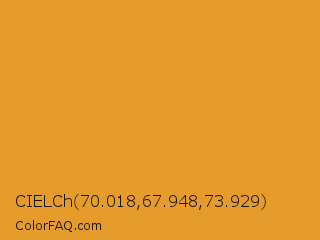 CIELCh 70.018,67.948,73.929 Color is a normal orange color and the nearest color is Fire Bush #e89928. Hex code #e69c2b and RGB value is rgb(230,156,43). In RGB color space, this color is composed of 90% red, 61% green, 17% blue, In CMYK color space, this color is composed of 0% cyan, 32% magenta, 81% yellow , 10% black , In HSL color space, this color has a hue angle of 36° , 79% saturation and 54% lightness.