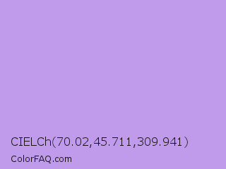 CIELCh 70.02,45.711,309.941 Color is a light violet color and the nearest color is Bright Lavender #bf94e4. Hex code #c19beb and RGB value is rgb(193,155,235). In RGB color space, this color is composed of 76% red, 61% green, 92% blue, In CMYK color space, this color is composed of 18% cyan, 34% magenta, 0% yellow , 8% black , In HSL color space, this color has a hue angle of 269° , 67% saturation and 76% lightness.