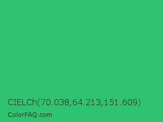 CIELCh 70.038,64.213,151.609 Color is a normal green color and the nearest color is UFO Green #3cd070. Hex code #2ec371 and RGB value is rgb(46,195,113). In RGB color space, this color is composed of 18% red, 76% green, 44% blue, In CMYK color space, this color is composed of 76% cyan, 0% magenta, 42% yellow , 24% black , In HSL color space, this color has a hue angle of 147° , 62% saturation and 47% lightness.