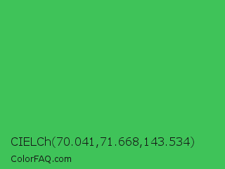 CIELCh 70.041,71.668,143.534 Color is a normal green color and the nearest color is UFO Green #3cd070. Hex code #3fc359 and RGB value is rgb(63,195,89). In RGB color space, this color is composed of 25% red, 76% green, 35% blue, In CMYK color space, this color is composed of 68% cyan, 0% magenta, 54% yellow , 24% black , In HSL color space, this color has a hue angle of 132° , 52% saturation and 51% lightness.