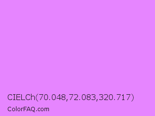 CIELCh 70.048,72.083,320.717 Color is a light purple color and the nearest color is Lavender Magenta #ee82ee. Hex code #e685ff and RGB value is rgb(230,133,255). In RGB color space, this color is composed of 90% red, 52% green, 100% blue, In CMYK color space, this color is composed of 10% cyan, 48% magenta, 0% yellow , 0% black , In HSL color space, this color has a hue angle of 288° , 100% saturation and 76% lightness.