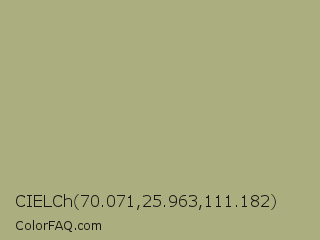 CIELCh 70.071,25.963,111.182 Color is a normal yellow color and the nearest color is Hillary #aca586. Hex code #abaf7f and RGB value is rgb(171,175,127). In RGB color space, this color is composed of 67% red, 69% green, 50% blue, In CMYK color space, this color is composed of 2% cyan, 0% magenta, 27% yellow , 31% black , In HSL color space, this color has a hue angle of 65° , 23% saturation and 59% lightness.