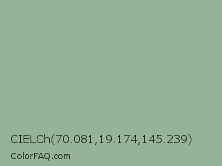CIELCh 70.081,19.174,145.239 Color is a light green color and the nearest color is Dark Sea Green #8fbc8f. Hex code #95b397 and RGB value is rgb(149,179,151). In RGB color space, this color is composed of 58% red, 70% green, 59% blue, In CMYK color space, this color is composed of 17% cyan, 0% magenta, 16% yellow , 30% black , In HSL color space, this color has a hue angle of 124° , 16% saturation and 64% lightness.