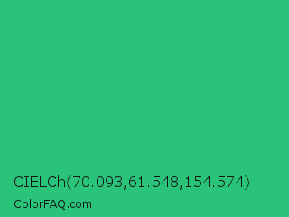 CIELCh 70.093,61.548,154.574 Color is a normal green color and the nearest color is UFO Green #3cd070. Hex code #29c379 and RGB value is rgb(41,195,121). In RGB color space, this color is composed of 16% red, 76% green, 47% blue, In CMYK color space, this color is composed of 79% cyan, 0% magenta, 38% yellow , 24% black , In HSL color space, this color has a hue angle of 151° , 65% saturation and 46% lightness.
