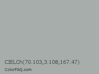 CIELCh 70.103,3.108,167.47 Color is a light green color and the nearest color is Edward #a2aeab. Hex code #a6adaa and RGB value is rgb(166,173,170). In RGB color space, this color is composed of 65% red, 68% green, 67% blue, In CMYK color space, this color is composed of 4% cyan, 0% magenta, 2% yellow , 32% black , In HSL color space, this color has a hue angle of 154° , 4% saturation and 66% lightness.