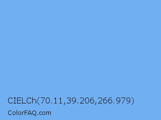 CIELCh 70.11,39.206,266.979 Color is a light blue color and the nearest color is Very Light Azure #74bbfb. Hex code #70b0f2 and RGB value is rgb(112,176,242). In RGB color space, this color is composed of 44% red, 69% green, 95% blue, In CMYK color space, this color is composed of 54% cyan, 27% magenta, 0% yellow , 5% black , In HSL color space, this color has a hue angle of 210° , 83% saturation and 69% lightness.