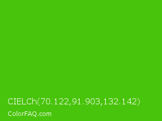 CIELCh 70.122,91.903,132.142 Color is a normal green color and the nearest color is Harlequin Green #46cb18. Hex code #49c40c and RGB value is rgb(73,196,12). In RGB color space, this color is composed of 29% red, 77% green, 5% blue, In CMYK color space, this color is composed of 63% cyan, 0% magenta, 94% yellow , 23% black , In HSL color space, this color has a hue angle of 100° , 88% saturation and 41% lightness.