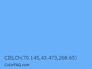 CIELCh 70.145,43.473,268.65 Color is a light blue color and the nearest color is French Sky Blue #77b5fe. Hex code #69b0fa and RGB value is rgb(105,176,250). In RGB color space, this color is composed of 41% red, 69% green, 98% blue, In CMYK color space, this color is composed of 58% cyan, 30% magenta, 0% yellow , 2% black , In HSL color space, this color has a hue angle of 211° , 94% saturation and 70% lightness.