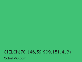 CIELCh 70.146,59.909,151.413 Color is a normal green color and the nearest color is UFO Green #3cd070. Hex code #40c275 and RGB value is rgb(64,194,117). In RGB color space, this color is composed of 25% red, 76% green, 46% blue, In CMYK color space, this color is composed of 67% cyan, 0% magenta, 40% yellow , 24% black , In HSL color space, this color has a hue angle of 144° , 52% saturation and 51% lightness.