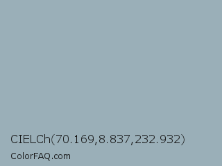 CIELCh 70.169,8.837,232.932 Color is a light blue color and the nearest color is Gull Gray #9dacb7. Hex code #9aafb8 and RGB value is rgb(154,175,184). In RGB color space, this color is composed of 60% red, 69% green, 72% blue, In CMYK color space, this color is composed of 16% cyan, 5% magenta, 0% yellow , 28% black , In HSL color space, this color has a hue angle of 198° , 17% saturation and 66% lightness.