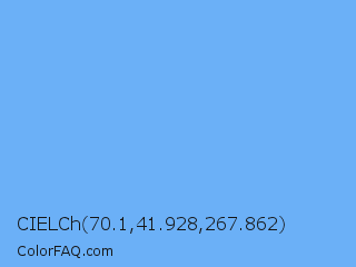 CIELCh 70.1,41.928,267.862 Color is a light blue color and the nearest color is Very Light Azure #74bbfb. Hex code #6bb0f7 and RGB value is rgb(107,176,247). In RGB color space, this color is composed of 42% red, 69% green, 97% blue, In CMYK color space, this color is composed of 57% cyan, 29% magenta, 0% yellow , 3% black , In HSL color space, this color has a hue angle of 210° , 90% saturation and 69% lightness.