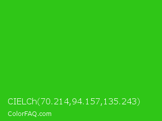 CIELCh 70.214,94.157,135.243 Color is a normal green color and the nearest color is Harlequin Green #46cb18. Hex code #2fc617 and RGB value is rgb(47,198,23). In RGB color space, this color is composed of 18% red, 78% green, 9% blue, In CMYK color space, this color is composed of 76% cyan, 0% magenta, 88% yellow , 22% black , In HSL color space, this color has a hue angle of 112° , 79% saturation and 43% lightness.