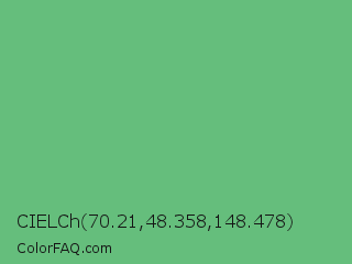 CIELCh 70.21,48.358,148.478 Color is a normal green color and the nearest color is Iguana Green #71bc78. Hex code #65be7c and RGB value is rgb(101,190,124). In RGB color space, this color is composed of 40% red, 75% green, 49% blue, In CMYK color space, this color is composed of 47% cyan, 0% magenta, 35% yellow , 25% black , In HSL color space, this color has a hue angle of 136° , 41% saturation and 57% lightness.