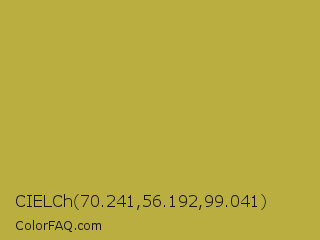 CIELCh 70.241,56.192,99.041 Color is a normal yellow color and the nearest color is Brass #b5a642. Hex code #baae41 and RGB value is rgb(186,174,65). In RGB color space, this color is composed of 73% red, 68% green, 25% blue, In CMYK color space, this color is composed of 0% cyan, 6% magenta, 65% yellow , 27% black , In HSL color space, this color has a hue angle of 54° , 48% saturation and 49% lightness.