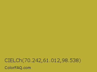 CIELCh 70.242,61.012,98.538 Color is a normal yellow color and the nearest color is Brass #b5a642. Hex code #bbae35 and RGB value is rgb(187,174,53). In RGB color space, this color is composed of 73% red, 68% green, 21% blue, In CMYK color space, this color is composed of 0% cyan, 7% magenta, 72% yellow , 27% black , In HSL color space, this color has a hue angle of 54° , 56% saturation and 47% lightness.