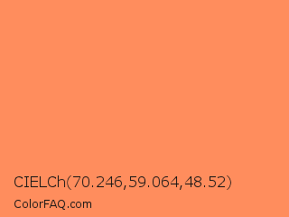 CIELCh 70.246,59.064,48.52 Color is a light orange color and the nearest color is Salmon #ff8c69. Hex code #ff8d5d and RGB value is rgb(255,141,93). In RGB color space, this color is composed of 100% red, 55% green, 36% blue, In CMYK color space, this color is composed of 0% cyan, 45% magenta, 64% yellow , 0% black , In HSL color space, this color has a hue angle of 18° , 100% saturation and 68% lightness.