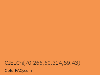 CIELCh 70.266,60.314,59.43 Color is a light orange color and the nearest color is Tan Hide #fa9d5a. Hex code #f5944d and RGB value is rgb(245,148,77). In RGB color space, this color is composed of 96% red, 58% green, 30% blue, In CMYK color space, this color is composed of 0% cyan, 40% magenta, 69% yellow , 4% black , In HSL color space, this color has a hue angle of 25° , 89% saturation and 63% lightness.