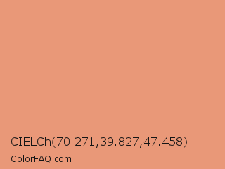 CIELCh 70.271,39.827,47.458 Color is a light orange color and the nearest color is Dark Salmon #e9967a. Hex code #e99878 and RGB value is rgb(233,152,120). In RGB color space, this color is composed of 91% red, 60% green, 47% blue, In CMYK color space, this color is composed of 0% cyan, 35% magenta, 48% yellow , 9% black , In HSL color space, this color has a hue angle of 17° , 72% saturation and 69% lightness.