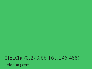 CIELCh 70.279,66.161,146.488 Color is a normal green color and the nearest color is UFO Green #3cd070. Hex code #42c366 and RGB value is rgb(66,195,102). In RGB color space, this color is composed of 26% red, 76% green, 40% blue, In CMYK color space, this color is composed of 66% cyan, 0% magenta, 48% yellow , 24% black , In HSL color space, this color has a hue angle of 137° , 52% saturation and 51% lightness.