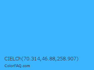 CIELCh 70.314,46.88,258.907 Color is a light blue color and the nearest color is Picton Blue #45b1e8. Hex code #3bb5ff and RGB value is rgb(59,181,255). In RGB color space, this color is composed of 23% red, 71% green, 100% blue, In CMYK color space, this color is composed of 77% cyan, 29% magenta, 0% yellow , 0% black , In HSL color space, this color has a hue angle of 203° , 100% saturation and 62% lightness.