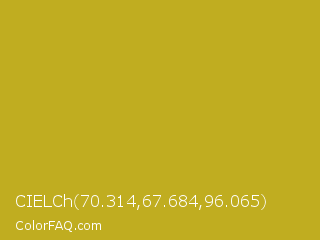 CIELCh 70.314,67.684,96.065 Color is a normal yellow color and the nearest color is Hokey Pokey #c8a528. Hex code #c0ad20 and RGB value is rgb(192,173,32). In RGB color space, this color is composed of 75% red, 68% green, 13% blue, In CMYK color space, this color is composed of 0% cyan, 10% magenta, 83% yellow , 25% black , In HSL color space, this color has a hue angle of 53° , 71% saturation and 44% lightness.