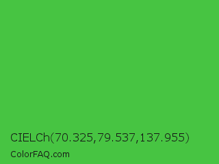 CIELCh 70.325,79.537,137.955 Color is a normal green color and the nearest color is Lime Green #32cd32. Hex code #47c442 and RGB value is rgb(71,196,66). In RGB color space, this color is composed of 28% red, 77% green, 26% blue, In CMYK color space, this color is composed of 64% cyan, 0% magenta, 66% yellow , 23% black , In HSL color space, this color has a hue angle of 118° , 52% saturation and 51% lightness.