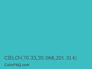 CIELCh 70.33,35.068,201.314 Color is a normal cyan color and the nearest color is Maximum Blue Green #30bfbf. Hex code #3bbdc2 and RGB value is rgb(59,189,194). In RGB color space, this color is composed of 23% red, 74% green, 76% blue, In CMYK color space, this color is composed of 70% cyan, 3% magenta, 0% yellow , 24% black , In HSL color space, this color has a hue angle of 182° , 53% saturation and 50% lightness.