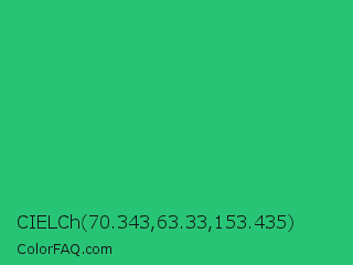 CIELCh 70.343,63.33,153.435 Color is a normal green color and the nearest color is UFO Green #3cd070. Hex code #28c476 and RGB value is rgb(40,196,118). In RGB color space, this color is composed of 16% red, 77% green, 46% blue, In CMYK color space, this color is composed of 80% cyan, 0% magenta, 40% yellow , 23% black , In HSL color space, this color has a hue angle of 150° , 66% saturation and 46% lightness.