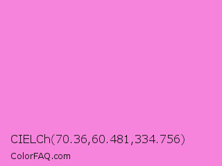 CIELCh 70.36,60.481,334.756 Color is a light magenta color and the nearest color is Pale Magenta #f984e5. Hex code #f684dc and RGB value is rgb(246,132,220). In RGB color space, this color is composed of 96% red, 52% green, 86% blue, In CMYK color space, this color is composed of 0% cyan, 46% magenta, 11% yellow , 4% black , In HSL color space, this color has a hue angle of 314° , 86% saturation and 74% lightness.