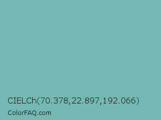 CIELCh 70.378,22.897,192.066 Color is a normal cyan color and the nearest color is Neptune #7cb7bb. Hex code #74b8b4 and RGB value is rgb(116,184,180). In RGB color space, this color is composed of 45% red, 72% green, 71% blue, In CMYK color space, this color is composed of 37% cyan, 0% magenta, 2% yellow , 28% black , In HSL color space, this color has a hue angle of 176° , 32% saturation and 59% lightness.