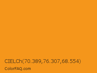 CIELCh 70.389,76.307,68.554 Color is a normal orange color and the nearest color is Tree Poppy #fc9c1d. Hex code #f5961b and RGB value is rgb(245,150,27). In RGB color space, this color is composed of 96% red, 59% green, 11% blue, In CMYK color space, this color is composed of 0% cyan, 39% magenta, 89% yellow , 4% black , In HSL color space, this color has a hue angle of 34° , 92% saturation and 53% lightness.
