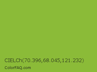 CIELCh 70.396,68.045,121.232 Color is a normal green color and the nearest color is Sushi #87ab39. Hex code #8bbb38 and RGB value is rgb(139,187,56). In RGB color space, this color is composed of 55% red, 73% green, 22% blue, In CMYK color space, this color is composed of 26% cyan, 0% magenta, 70% yellow , 27% black , In HSL color space, this color has a hue angle of 82° , 54% saturation and 48% lightness.