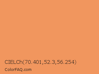 CIELCh 70.401,52.3,56.254 Color is a light orange color and the nearest color is Tan Hide #fa9d5a. Hex code #f1965e and RGB value is rgb(241,150,94). In RGB color space, this color is composed of 95% red, 59% green, 37% blue, In CMYK color space, this color is composed of 0% cyan, 38% magenta, 61% yellow , 5% black , In HSL color space, this color has a hue angle of 23° , 84% saturation and 66% lightness.