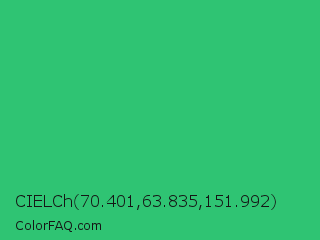 CIELCh 70.401,63.835,151.992 Color is a normal green color and the nearest color is UFO Green #3cd070. Hex code #2fc473 and RGB value is rgb(47,196,115). In RGB color space, this color is composed of 18% red, 77% green, 45% blue, In CMYK color space, this color is composed of 76% cyan, 0% magenta, 41% yellow , 23% black , In HSL color space, this color has a hue angle of 147° , 61% saturation and 48% lightness.