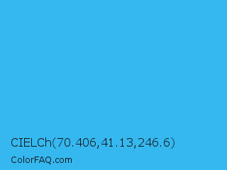 CIELCh 70.406,41.13,246.6 Color is a normal blue color and the nearest color is Picton Blue #45b1e8. Hex code #35b8f0 and RGB value is rgb(53,184,240). In RGB color space, this color is composed of 21% red, 72% green, 94% blue, In CMYK color space, this color is composed of 78% cyan, 23% magenta, 0% yellow , 6% black , In HSL color space, this color has a hue angle of 198° , 86% saturation and 57% lightness.