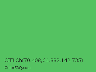 CIELCh 70.408,64.882,142.735 Color is a normal green color and the nearest color is Fern #63b76c. Hex code #54c261 and RGB value is rgb(84,194,97). In RGB color space, this color is composed of 33% red, 76% green, 38% blue, In CMYK color space, this color is composed of 57% cyan, 0% magenta, 50% yellow , 24% black , In HSL color space, this color has a hue angle of 127° , 47% saturation and 55% lightness.