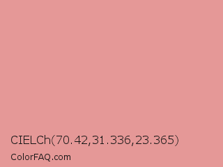 CIELCh 70.42,31.336,23.365 Color is a light red color and the nearest color is Sea Pink #ed989e. Hex code #e59897 and RGB value is rgb(229,152,151). In RGB color space, this color is composed of 90% red, 60% green, 59% blue, In CMYK color space, this color is composed of 0% cyan, 34% magenta, 34% yellow , 10% black , In HSL color space, this color has a hue angle of 1° , 60% saturation and 75% lightness.