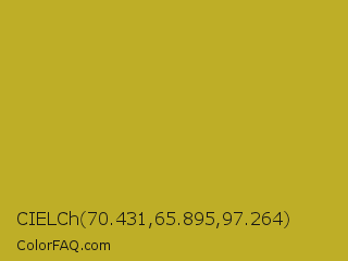 CIELCh 70.431,65.895,97.264 Color is a normal yellow color and the nearest color is Hokey Pokey #c8a528. Hex code #beae27 and RGB value is rgb(190,174,39). In RGB color space, this color is composed of 75% red, 68% green, 15% blue, In CMYK color space, this color is composed of 0% cyan, 8% magenta, 79% yellow , 25% black , In HSL color space, this color has a hue angle of 54° , 66% saturation and 45% lightness.