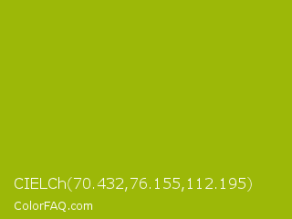 CIELCh 70.432,76.155,112.195 Color is a normal yellow color and the nearest color is Pistachio Green #9dc209. Hex code #9cb808 and RGB value is rgb(156,184,8). In RGB color space, this color is composed of 61% red, 72% green, 3% blue, In CMYK color space, this color is composed of 15% cyan, 0% magenta, 96% yellow , 28% black , In HSL color space, this color has a hue angle of 70° , 92% saturation and 38% lightness.