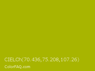 CIELCh 70.436,75.208,107.26 Color is a normal yellow color and the nearest color is Pistachio Green #9dc209. Hex code #a8b500 and RGB value is rgb(168,181,0). In RGB color space, this color is composed of 66% red, 71% green, 0% blue, In CMYK color space, this color is composed of 7% cyan, 0% magenta, 100% yellow , 29% black , In HSL color space, this color has a hue angle of 64° , 100% saturation and 35% lightness.