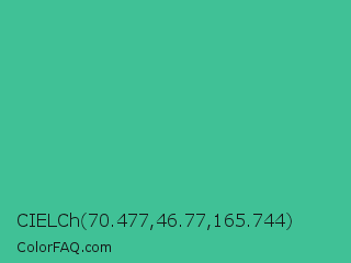 CIELCh 70.477,46.77,165.744 Color is a normal green color and the nearest color is Ocean Green #48bf91. Hex code #40c196 and RGB value is rgb(64,193,150). In RGB color space, this color is composed of 25% red, 76% green, 59% blue, In CMYK color space, this color is composed of 67% cyan, 0% magenta, 22% yellow , 24% black , In HSL color space, this color has a hue angle of 160° , 51% saturation and 50% lightness.