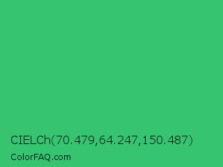 CIELCh 70.479,64.247,150.487 Color is a normal green color and the nearest color is UFO Green #3cd070. Hex code #36c470 and RGB value is rgb(54,196,112). In RGB color space, this color is composed of 21% red, 77% green, 44% blue, In CMYK color space, this color is composed of 72% cyan, 0% magenta, 43% yellow , 23% black , In HSL color space, this color has a hue angle of 145° , 57% saturation and 49% lightness.