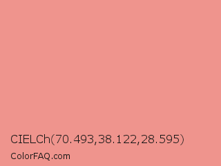 CIELCh 70.493,38.122,28.595 Color is a light red color and the nearest color is Tonys Pink #e79f8c. Hex code #ef948d and RGB value is rgb(239,148,141). In RGB color space, this color is composed of 94% red, 58% green, 55% blue, In CMYK color space, this color is composed of 0% cyan, 38% magenta, 41% yellow , 6% black , In HSL color space, this color has a hue angle of 4° , 75% saturation and 75% lightness.