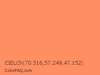 CIELCh 70.516,57.249,47.152 Color is a light orange color and the nearest color is Salmon #ff8c69. Hex code #ff8e62 and RGB value is rgb(255,142,98). In RGB color space, this color is composed of 100% red, 56% green, 38% blue, In CMYK color space, this color is composed of 0% cyan, 44% magenta, 62% yellow , 0% black , In HSL color space, this color has a hue angle of 17° , 100% saturation and 69% lightness.