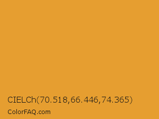 CIELCh 70.518,66.446,74.365 Color is a normal orange color and the nearest color is Fire Bush #e89928. Hex code #e69e30 and RGB value is rgb(230,158,48). In RGB color space, this color is composed of 90% red, 62% green, 19% blue, In CMYK color space, this color is composed of 0% cyan, 31% magenta, 79% yellow , 10% black , In HSL color space, this color has a hue angle of 36° , 78% saturation and 55% lightness.