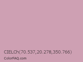 CIELCh 70.537,20.278,350.766 Color is a light rose color and the nearest color is Careys Pink #d29eaa. Hex code #cea0b3 and RGB value is rgb(206,160,179). In RGB color space, this color is composed of 81% red, 63% green, 70% blue, In CMYK color space, this color is composed of 0% cyan, 22% magenta, 13% yellow , 19% black , In HSL color space, this color has a hue angle of 335° , 32% saturation and 72% lightness.